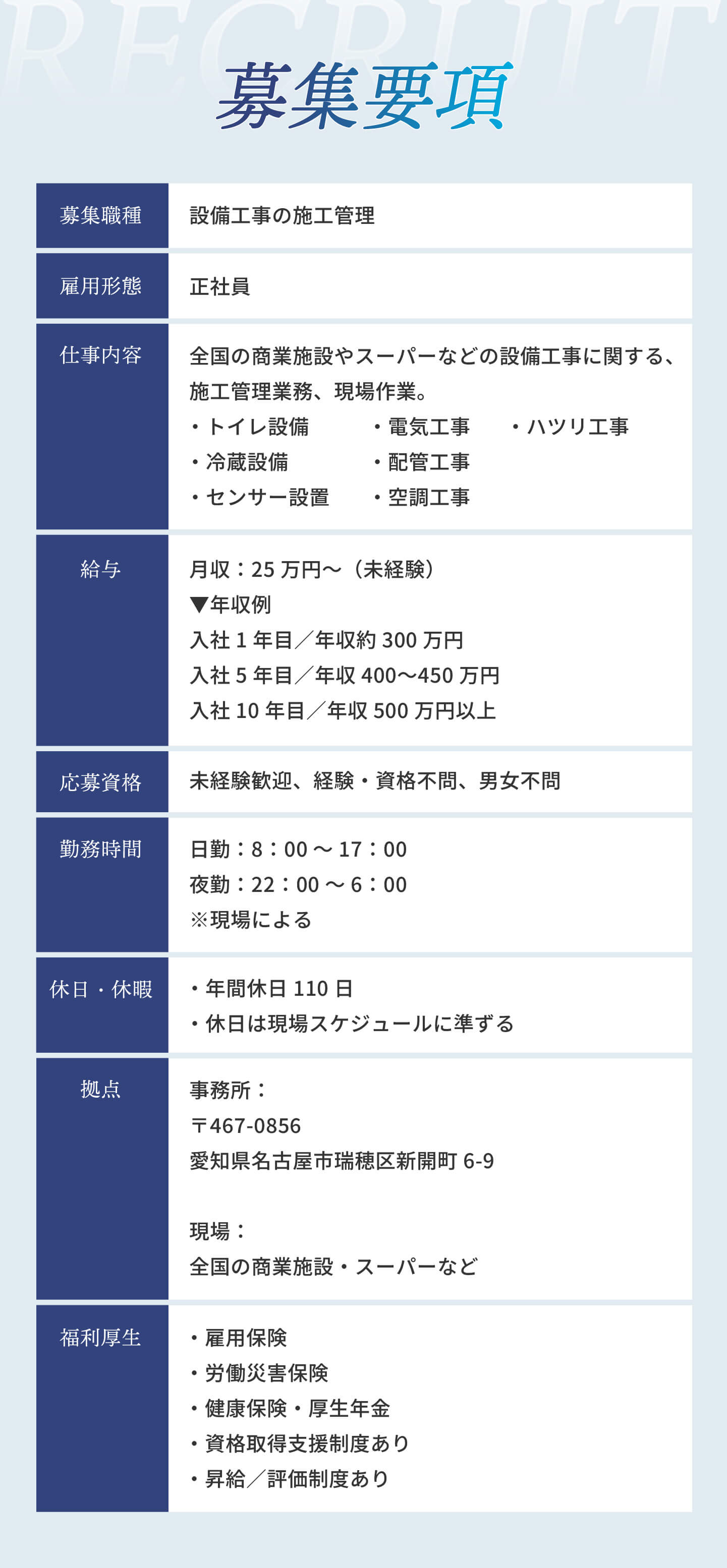 | 事業内容 | 電気・空調・衛生・消防設備工事、環境・省エネ機器販売・施工・保守 |